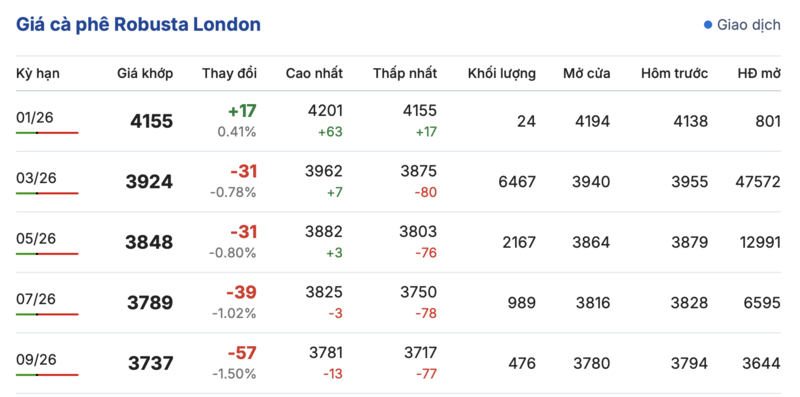 Kết thúc phiên giao dịch gần nhất, giá cà phê Robusta tại London tăng giảm trái chiều trong các kỳ giao hàng. Cụ thể, kỳ giao tháng 1/2026 đảo chiều tăng nhẹ 17 USD/tấn, lên mức 4155 USD/tấn. Trong khi đó, hợp đồng giao kỳ hạn tháng 9/2026 lại tiếp tục giảm thêm 57 USD/tấn, đạt mức 3737 USD/tấn.