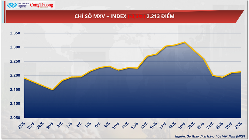 Theo Sở Giao dịch Hàng hóa Việt Nam (MXV), thị trường hàng hóa nguyên liệu thế giới tiếp tục biến động rất mạnh trong tuần giao dịch vừa qua (23-29/6). Đóng cửa, lực bán áp đảo đã kéo chỉ số MXV-Index lao dốc tới 3,3% xuống mức 2.213 điểm. Đáng chú là diễn biến trái chiều giữa thị trường năng lượng và kim loại. Trong khi 5 mặt hàng năng lượng khép tuần giao dịch trong sắc đỏ thì thị trường kim loại chứng kiến toàn bộ các mặt hàng đồng loạt tăng giá.