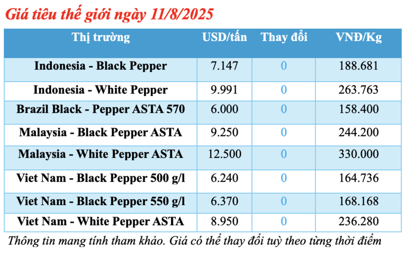 Cập nhật giá tiêu thế giới từ Hiệp hội Hồ tiêu Quốc tế (IPC) cập nhật vào sáng ngày 11/8/2025, thị trường thế duy trì ổn định, không có sự biến động tại sàn giao dịch lớn.