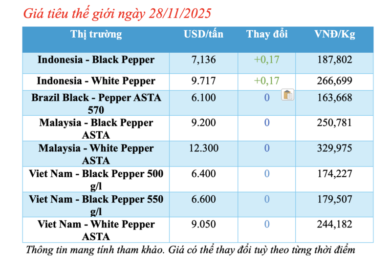 Cập nhật giá tiêu thế giới từ Hiệp hội Hồ tiêu Quốc tế (IPC) sáng 28/11/2025, hồ tiêu xuất khẩu hôm nay ghi nhận biến động nhẹ tại thị trường Indonesia. Các thị trường khác đều ổn định giá so với phiên giao dịch hôm qua.