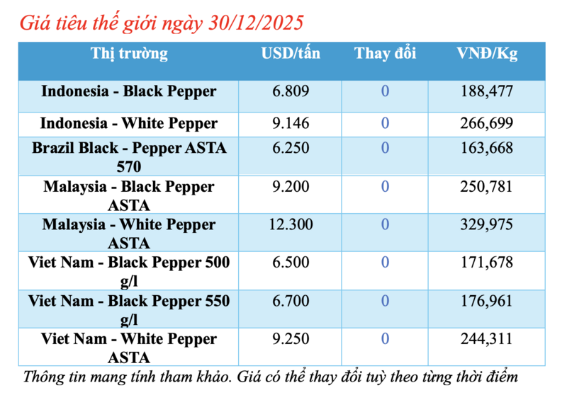 Cập nhật giá tiêu thế giới từ Hiệp hội Hồ tiêu Quốc tế (IPC) sáng 30/12/2025, hồ tiêu xuất khẩu hôm nay không ghi nhận biến động. Các thị trường đều ổn định giá so với phiên giao dịch hôm qua.