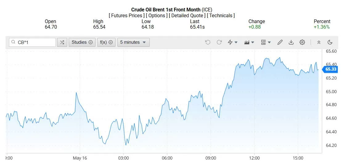 Ghi nhận trên Oilprice lúc 4h30 ngày 19/05/2025 (theo giờ Việt Nam), giá dầu Brent ở mốc 65,33 USD/thùng, tăng 1,36% (tương đương tăng 0,88 USD/thùng).