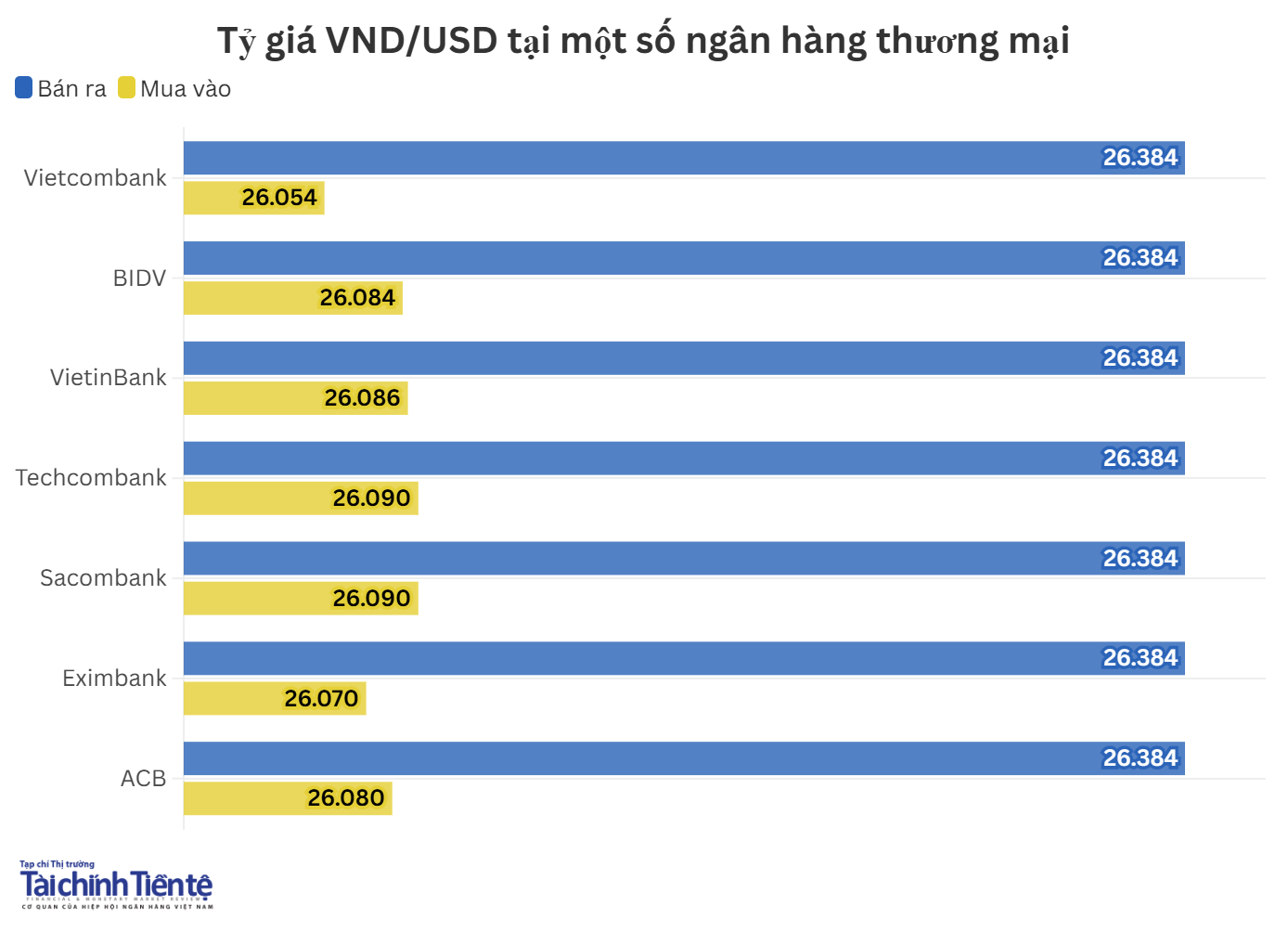 Hiện, giá mua thấp nhất ở mức 26.054 VND/USD, giá mua cao nhất ở mức 26.090 VND/USD. Giá bán ra được các ngân hàng đồng loạt niêm yết ở mức 26.384 VND/USD.