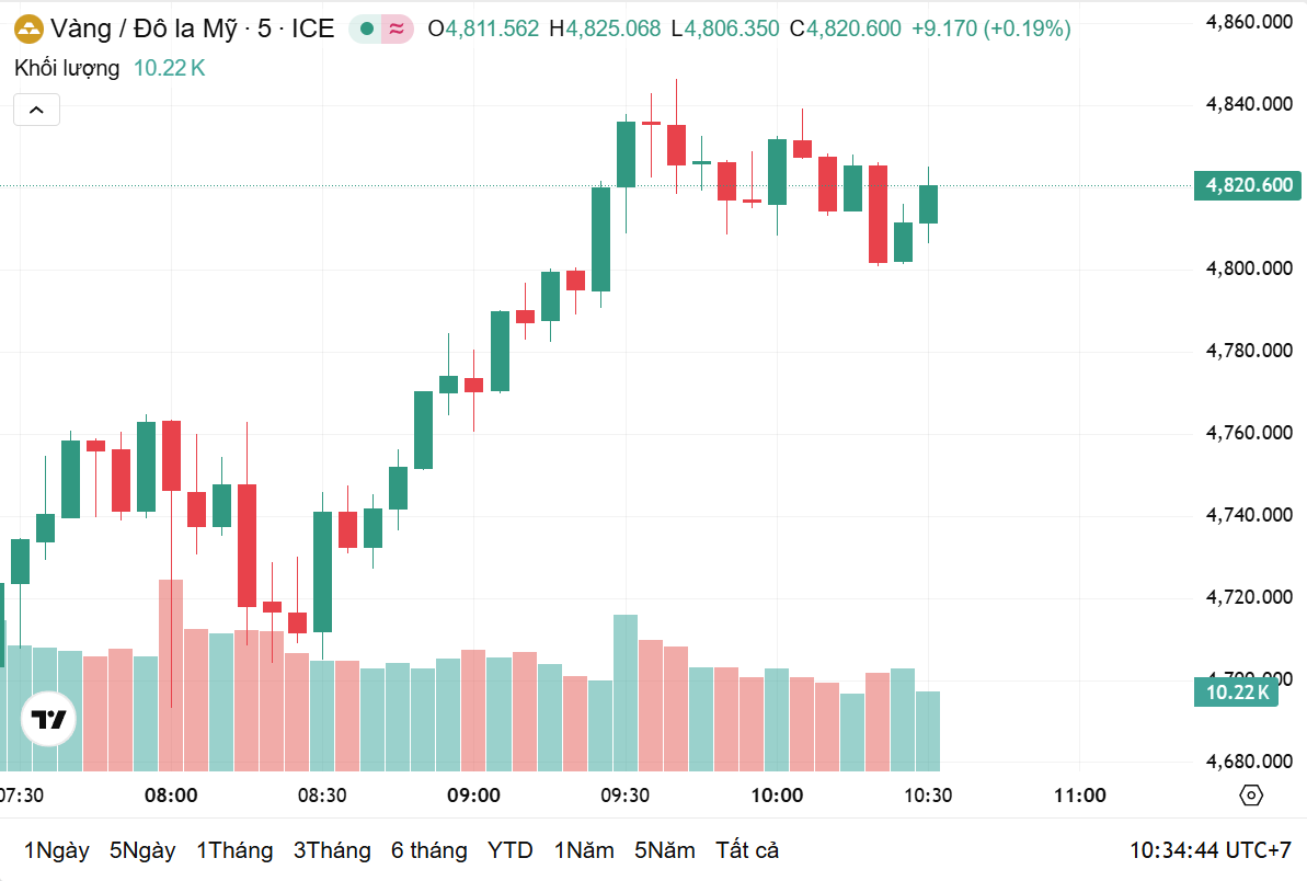 Thời điểm 10h10 theo giờ Việt Nam, giá vàng thế giới giao ngay ở mức 4.820 USD/ounce, giảm 2,16% trong 24 giờ qua, tương ứng với giảm 106.61 USD/ounce. Hiện, giá vàng thế giới quy đổi sang tiền Việt Nam đồng khoảng 152 triệu đồng/lượng.