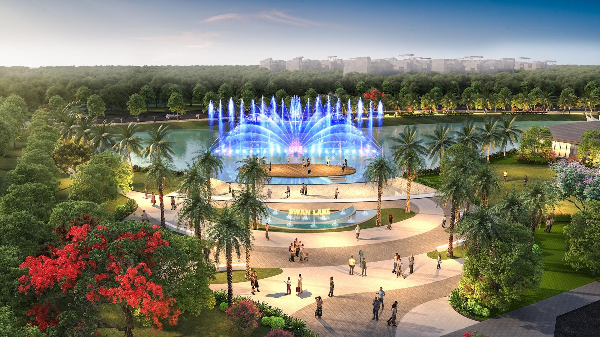Bao quanh hồ là hệ tiện ích hướng tới vận động và trải nghiệm cảm xúc: đường dạo bộ lát đá, làn đạp xe ngoài trời, vườn hoa bốn mùa, sân khấu nổi Dancing Queen, đài phun nhạc nước Melody, cầu tình yêu lãng mạn và quảng trường trước nhà hàng cộng đồng Swan Pavilion. Đây vừa là những điểm check-in, vừa là một liệu pháp “sống lành”, mỗi cư dân đều có thể giải tỏa áp lực, thiền định, đi dạo, đạp xe hoặc đơn giản chỉ là hít thở không khí trong lành.