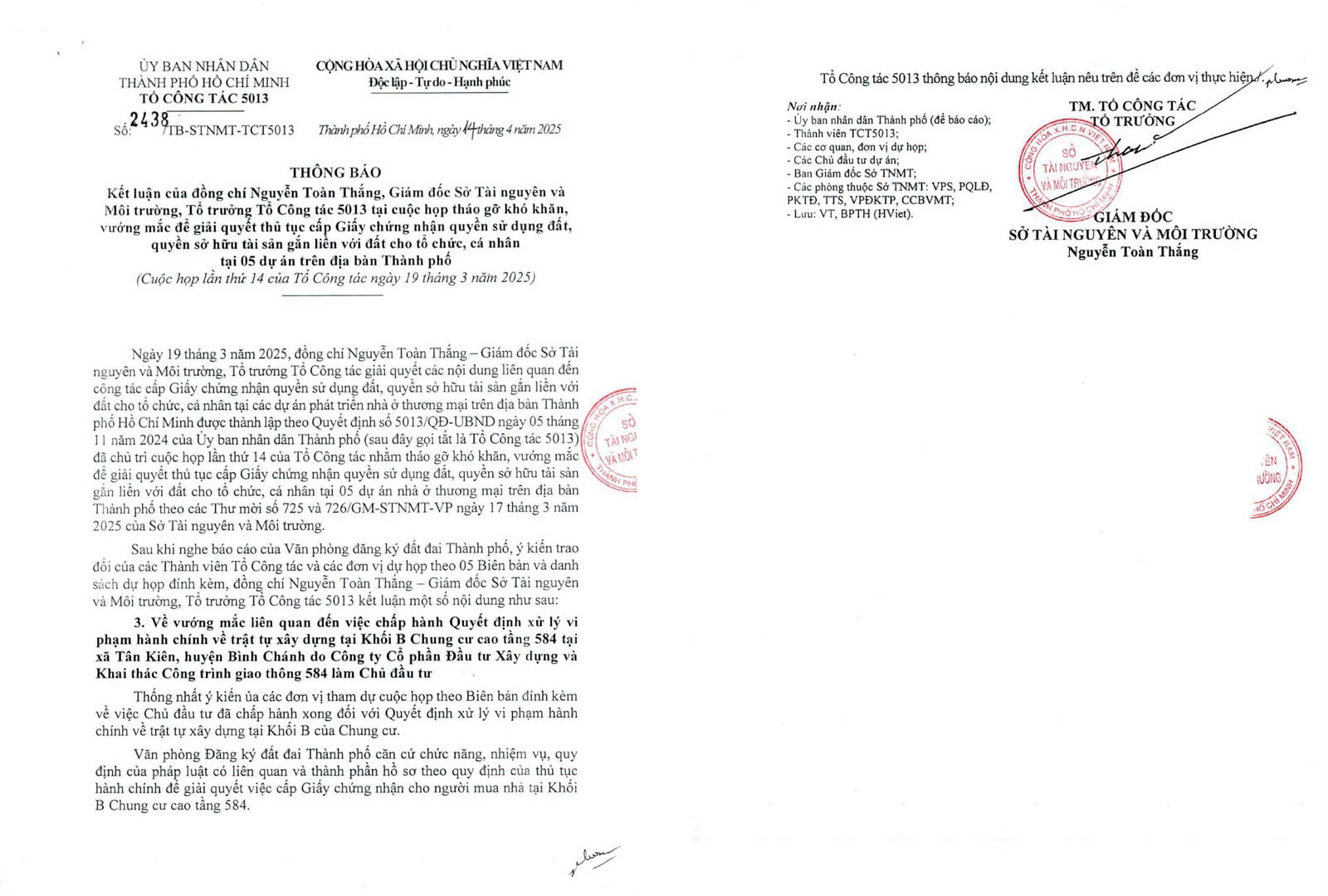 Văn bản thông báo về việc chấp thuận cấp giấy chứng nhận cho người mua căn hộ Conic Boulevard