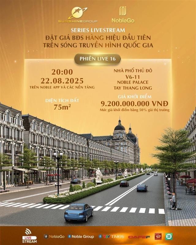Ngày 22/8 tới đây, Sunshine Group sẽ tiếp tục lên sóng livestream căn nhà phố thứ 5 thuộc dự án Noble Palace Tay Thang Long. Sự kiện hứa hẹn nối dài sức nóng của loạt livestream đặt giá mua nhà NobleGo - mô hình đang thu hút mạnh mẽ sự quan tâm từ thị trường nhờ tính minh bạch, tương tác thực tế và cơ hội sở hữu nhà hàng hiệu với mức giá tối ưu bậc nhất hiện nay.