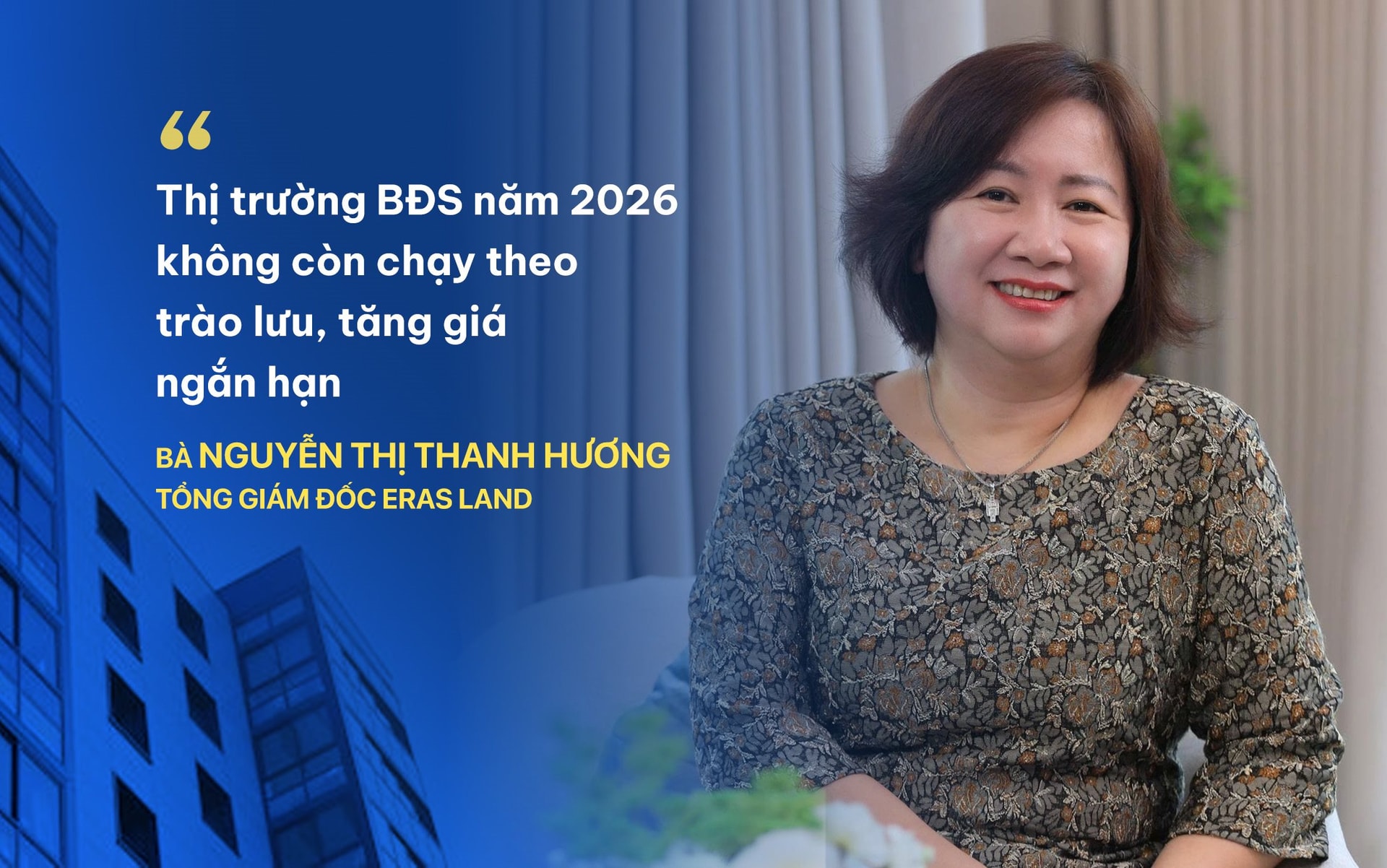Theo bà Nguyễn Thị Thanh Hương, Tổng Giám đốc Công ty Cổ phần Đầu tư Bất động sản Eras Land (Eras Land), bất động sản vẫn là kênh đầu tư quan trọng, nhưng chỉ phù hợp với những người sẵn sàng đi đường dài và ưu tiên sự bền vững. Người mua hiện nay không còn tìm kiếm những sản phẩm chỉ để chờ tăng giá…