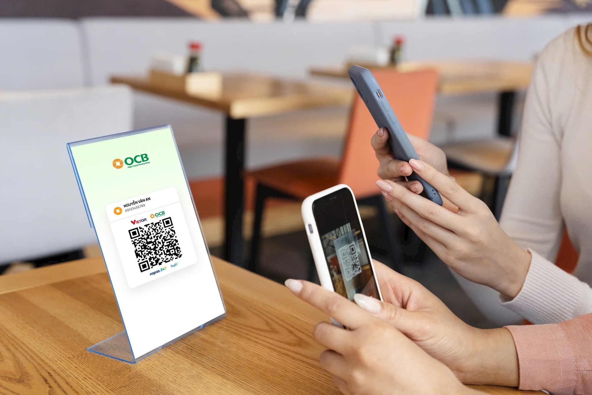 Tại ngân hàng Phương Đông (OCB), nhà băng này đem đến giải pháp thanh toán OCB VietQR với nhiều tính năng ưu việt. Theo đó, quá trình thanh toán chỉ còn 3 giây. Mỗi đơn hàng khi giao dịch (bao gồm cả online và offline) sẽ hiển thị một mã QR động riêng biệt và chỉ với một thao tác quét mã, người dùng có thể thực hiện thanh toán một cách chính xác và miễn phí. Cửa hàng nhận tiền ngay lập tức về tài khoản thông qua hệ thống ngân hàng Napas247 và các ví điện tử mọi nơi mọi lúc, kể cả ngoài giờ hành chính và cuối tuần.