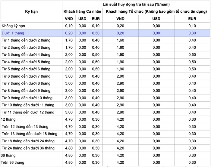 Bên cạnh đó, các khoản tiền gửi không kỳ hạn và kỳ hạn dưới 1 tháng hiện đang được duy trì mức lãi suất huy động lần lượt là 0,1%/năm và 0,2%/năm.