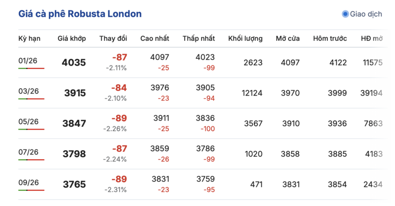 Kết thúc phiên giao dịch gần nhất, giá cà phê Robusta tại London giảm đồng loạt qua các kỳ giao hàng. Cụ thể, kỳ giao tháng 1/2026 giảm 87 USD/tấn, đạt mức 4035 USD/tấn. Trong khi hợp đồng giao kỳ hạn tháng 9/2026 giảm 89 USD/tấn, xuống mức 3765 USD/tấn.