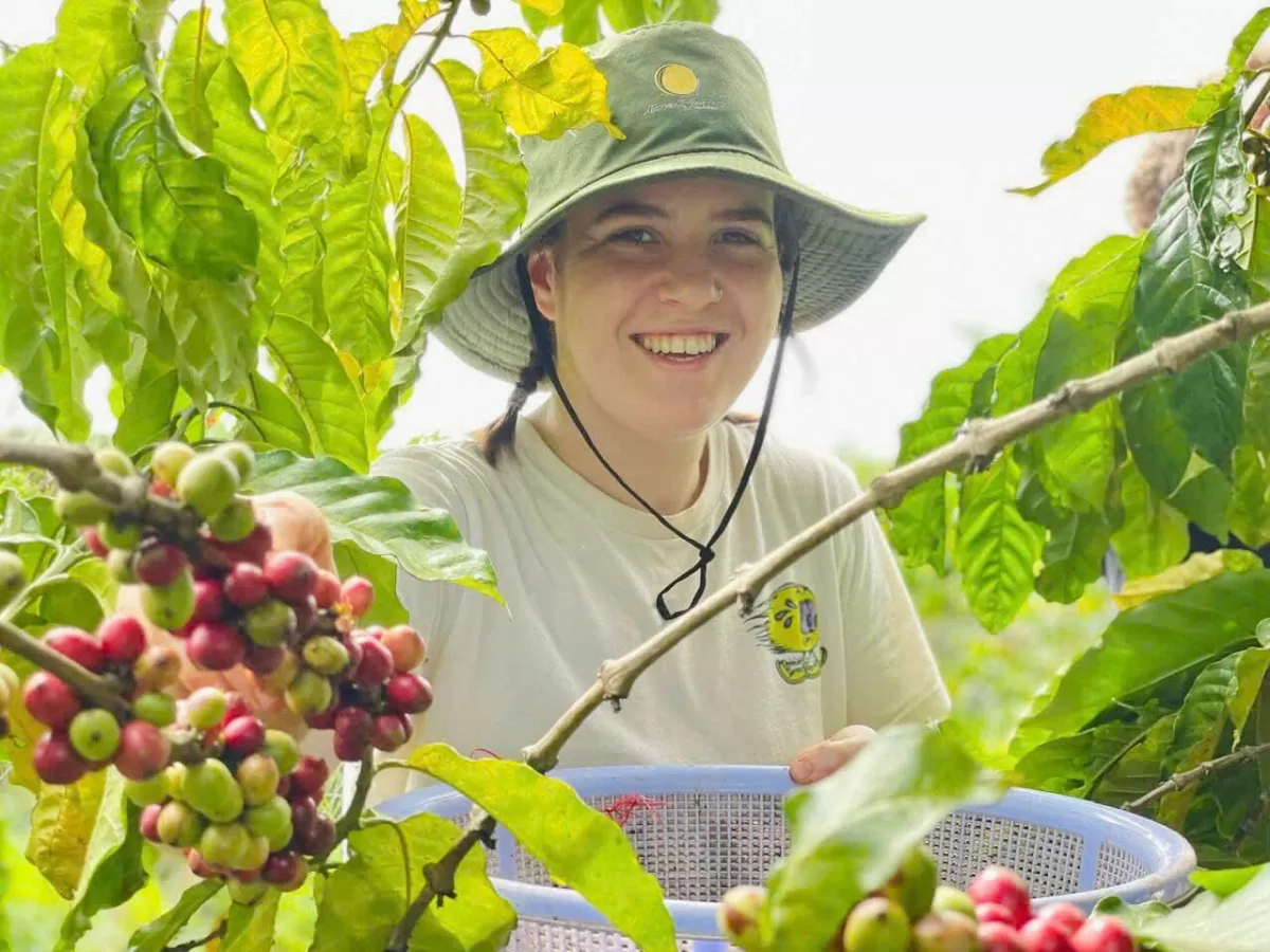 Người nước ngoài trải nghiệm hái cà phê ở Gia Lai. Ảnh: Hiền Mai |