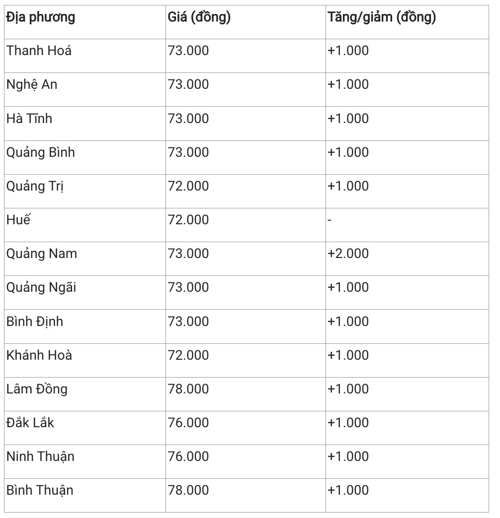 Hiện giá heo hơi khu vực này dao động 72.000 – 78.000 đồng/kg. Trong đó, Lâm Đồng và Bình Thuận có giá heo hơi cao nhất khu vực với 78.000 đồng/kg tại; tiếp đến Đắk Lắk và Ninh Thuận đạt 76.000 đồng/kg. Các tỉnh, thành phố còn lại trong vùng, có giá heo hơi dao động từ 72.000 - 73.000 đồng/kg.