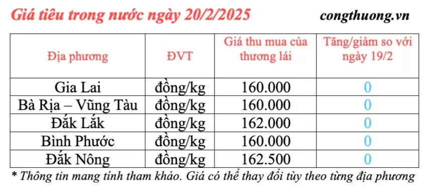 Giá tiêu hôm nay được cập nhật lúc 4h30 sáng ngày 20/2/2025 như sau, giá tiêu trong nước duy trì ổn định và neo ở mức cao, giá tiêu cao nhất đạt mức 162.500 đồng/kg. Hiện giá tiêu thu mua trung bình tại các địa bàn trọng điểm là 160.900 đồng/kg.