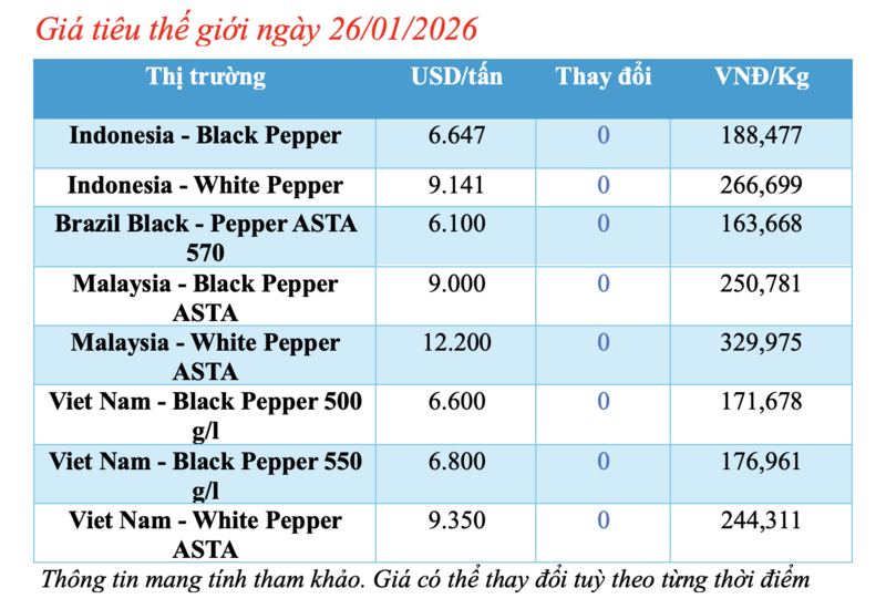 Giá hồ tiêu thế giới 26/01/2026: Đi ngang