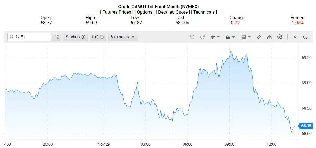 Ghi nhận trên Oilprice lúc 4h30 ngày 02/12/2024 (theo giờ Việt Nam), giá dầu WTI ở mốc 68,15 USD/thùng, giảm 1,05% (tương đương giảm 0,72 USD/thùng).