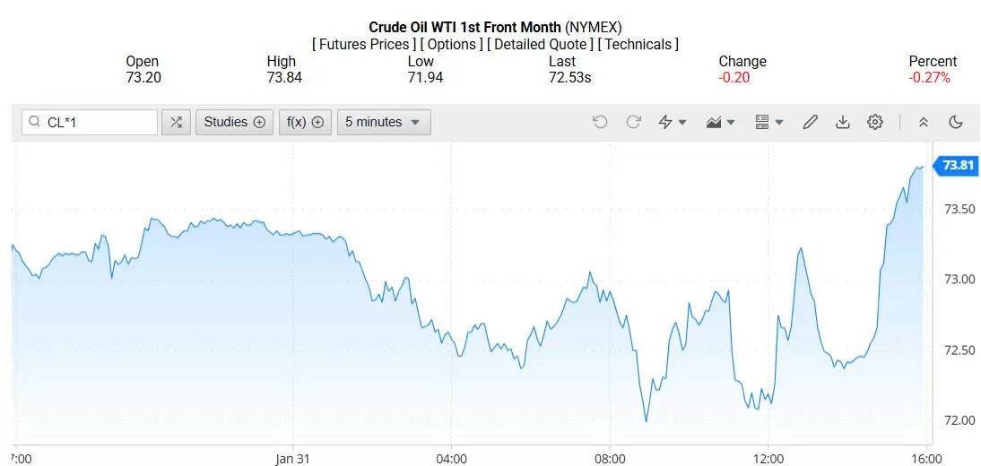 Ghi nhận trên Oilprice lúc 4h30 ngày 03/02/2025 (theo giờ Việt Nam), giá dầu WTI ở mốc 73,81 USD/thùng, giảm 0,27% (tương đương giảm 0,20 USD/thùng).