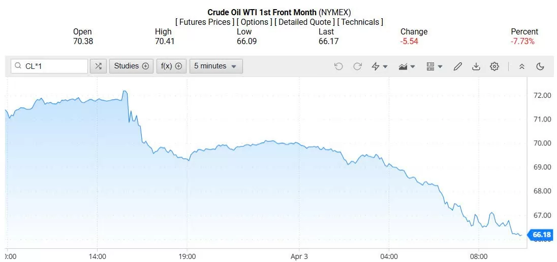 Ghi nhận trên Oilprice lúc 4h ngày 04/04/2025 (theo giờ Việt Nam), giá dầu WTI ở mốc 66,18 USD/thùng, giảm 7,73% (tương đương giảm 5,54 USD/thùng).