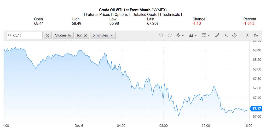 Ghi nhận trên Oilprice lúc 4h30 ngày 09/12/2024 (theo giờ Việt Nam), giá dầu WTI ở mốc 67,17 USD/thùng, giảm 1,61% (tương đương giảm 1,10 USD/thùng).