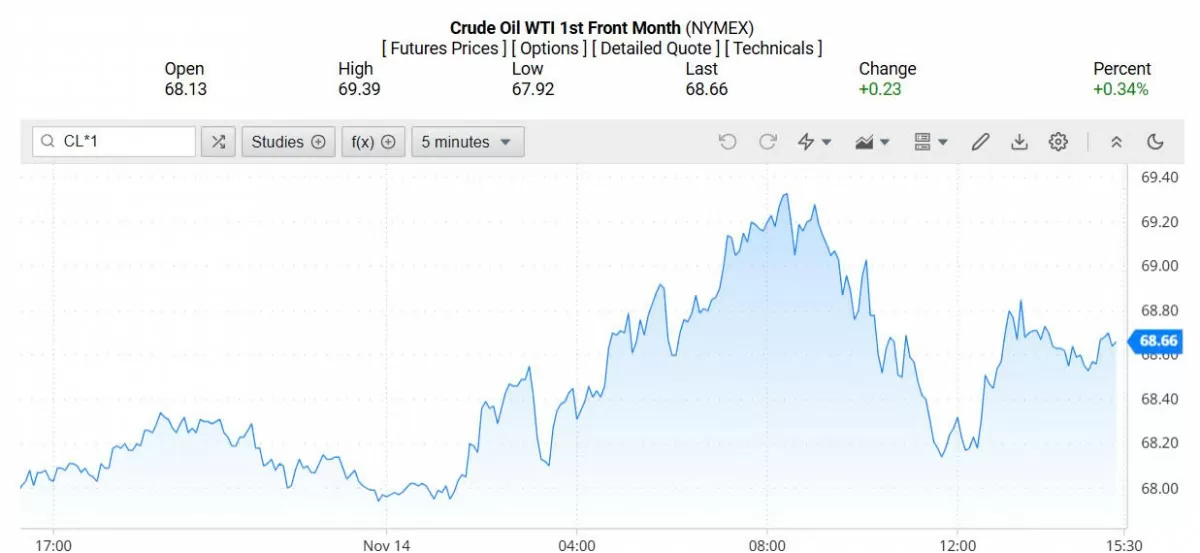 Ghi nhận trên Oilprice lúc 5h ngày 15/11/2024 (theo giờ Việt Nam), giá dầu WTI ở mốc 68,88 USD/thùng, tăng 0,34% (tương đương giảm 0,23 USD/thùng).