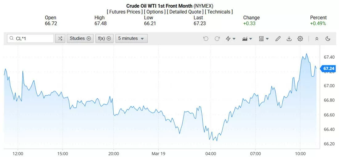 Ghi nhận trên Oilprice lúc 4h ngày 20/03/2025 (theo giờ Việt Nam), giá dầu WTI ở mốc 67,24 USD/thùng, tăng 0,49% (tương đương tăng 0,33 USD/thùng).