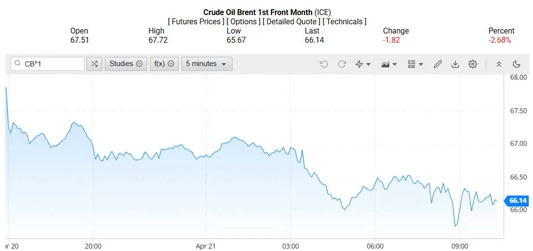 Ghi nhận trên Oilprice lúc 4h30 ngày 22/04/2025 (theo giờ Việt Nam), giá dầu Brent ở mốc 66,14 USD/thùng, giảm 2,68% (tương đương giảm 1,82 USD/thùng).