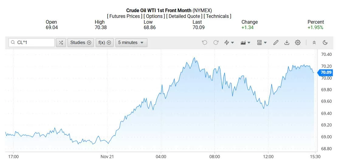 Ghi nhận trên Oilprice lúc 5h ngày 22/11/2024 (theo giờ Việt Nam), giá dầu WTI ở mốc 70,09 USD/thùng, tăng 1,95% (tương đương tăng 1,34 USD/thùng).