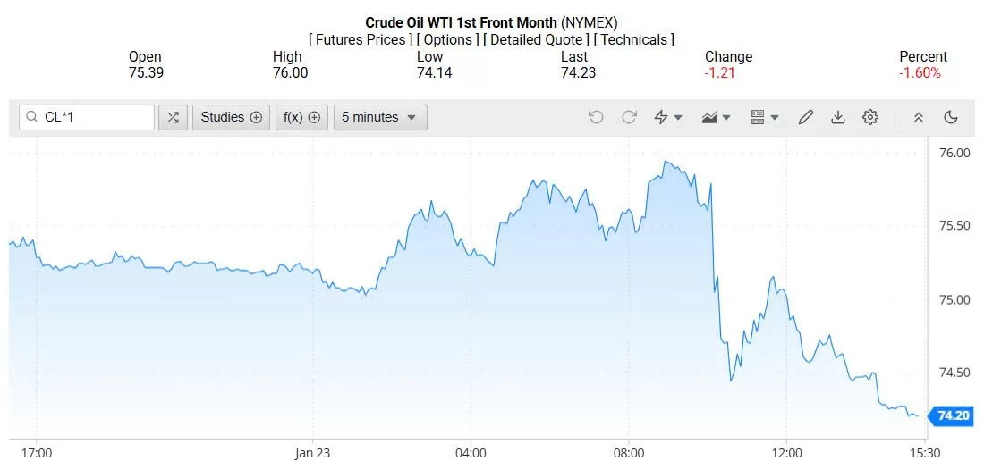 Ghi nhận trên Oilprice lúc 4h30 ngày 24/01/2025 (theo giờ Việt Nam), giá dầu WTI ở mốc 74,2 USD/thùng, giảm 1,60% (tương đương giảm 1,21 USD/thùng).