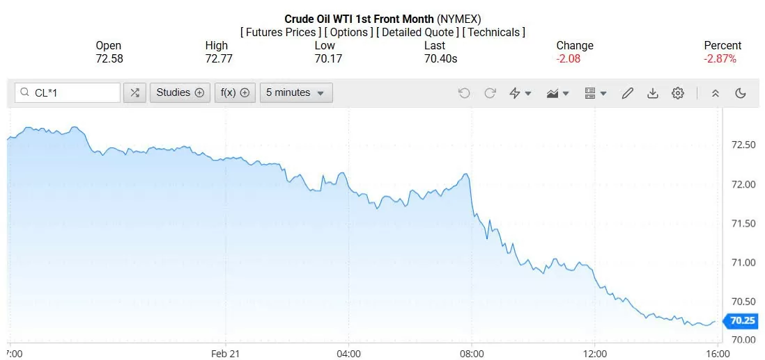 Ghi nhận trên Oilprice lúc 4h ngày 24/02/2025 (theo giờ Việt Nam), giá dầu WTI ở mốc 70,25 USD/thùng, giảm 2,87% (tương đương giảm 2,08 USD/thùng).