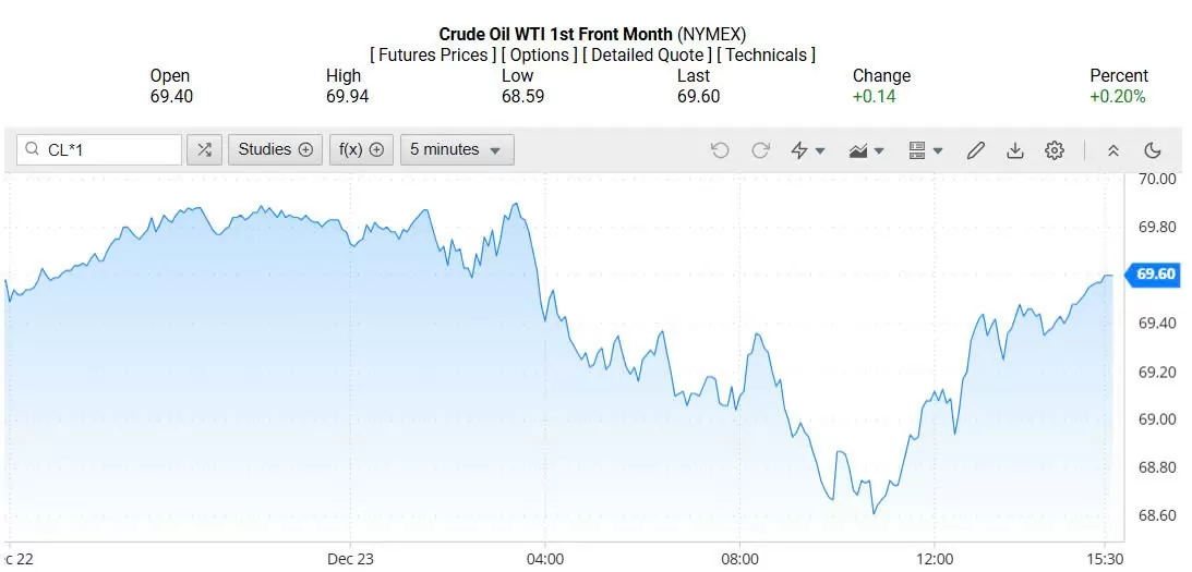 Ghi nhận trên Oilprice lúc 4h30 ngày 24/12/2024 (theo giờ Việt Nam), giá dầu WTI ở mốc 69,6 USD/thùng, tăng 0,2% (tương đương tăng 0,14 USD/thùng).
