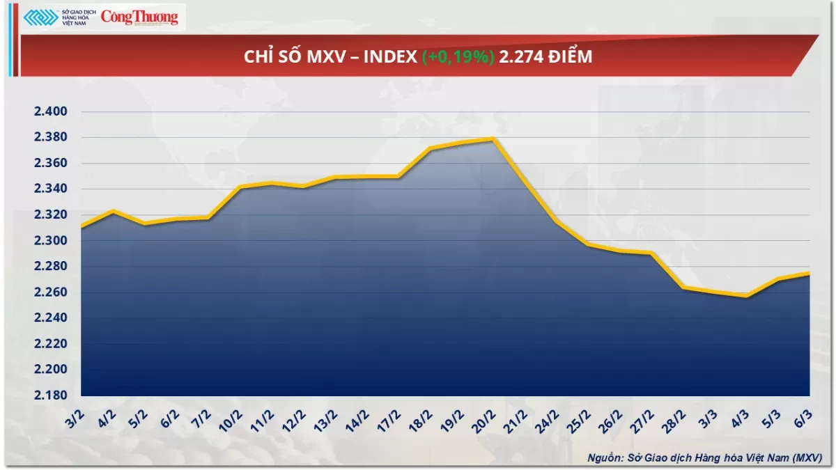 Theo Sở Giao dịch Hàng hóa Việt Nam (MXV), lực mua tiếp tục gia tăng trên thị trường hàng hóa nguyên liệu trong ngày giao dịch hôm qua (6/3). Nối dài đà phục hồi sang phiên thứ hai, chỉ số MXV-Index tăng tiếp 0,2% lên mức 2.274 điểm. Thị trường nông sản và kim loại gây chú ý khi nhiều mặt hàng đồng loạt đóng cửa trong sắc xanh.
