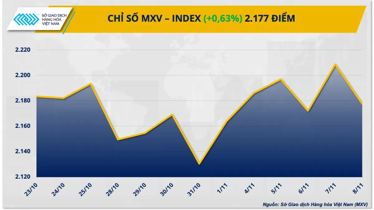 Theo Sở Giao dịch Hàng hóa Việt Nam (MXV), tuần giao dịch qua (4 - 10/11), dòng tiền đầu tư có xu hướng dịch chuyển từ các thị trường trú ẩn sang các thị trường có tính sinh lời cao hơn như hàng hóa. Lực mua chiếm áp đảo kéo chỉ số MXV-Index tăng 0,63% lên 2.177 điểm. Đáng chú ý, trên thị trường nông sản, giá mặt hàng đậu tương và ngô đều tăng vọt gần 4% trong bối cảnh triển vọng nguồn cung thấp hơn dự kiến và nhu cầu cao. Bên cạnh đó, trên thị trường nguyên liệu công nghiệp, giá hai mặt hàng cà phê đứt chuỗi giảm nhiều tuần liên tiếp trước đó.