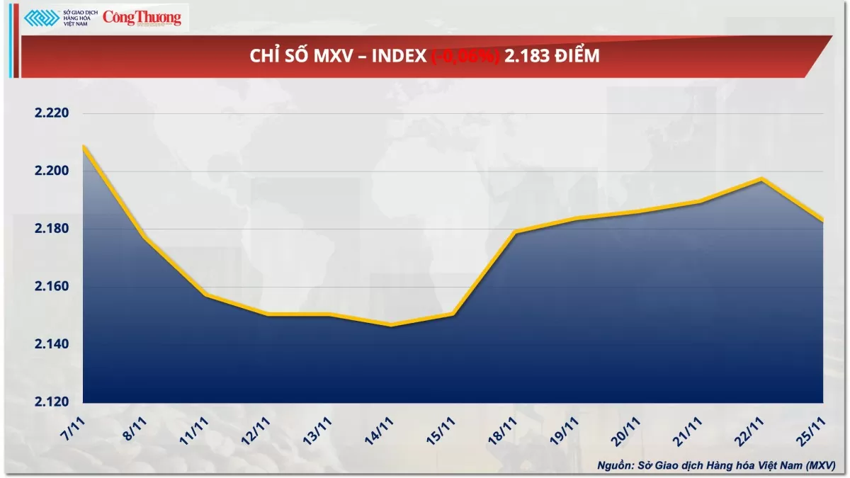 Theo Sở Giao dịch Hàng hóa Việt Nam (MXV), lực bán chiếm ưu thế trên thị trường hàng hóa nguyên liệu thế giới trong phiên giao dịch ngày 25/11. Đóng cửa, chỉ số MXV-Index giảm 0,66% xuống 2.183 điểm, chấm dứt chuỗi tăng 6 phiên liên tiếp trước đó. Đáng chú ý, nhóm năng lượng giảm mạnh khi giá hai mặt hàng dầu thô đồng loạt đi xuống do kỳ vọng nguồn cung dầu toàn cầu dồi dào hơn. Diễn biến tương tự diễn ra trên thị trường kim loại quý khi giá bạc và bạch kim suy yếu trước áp lực chốt lời của giới đầu tư.