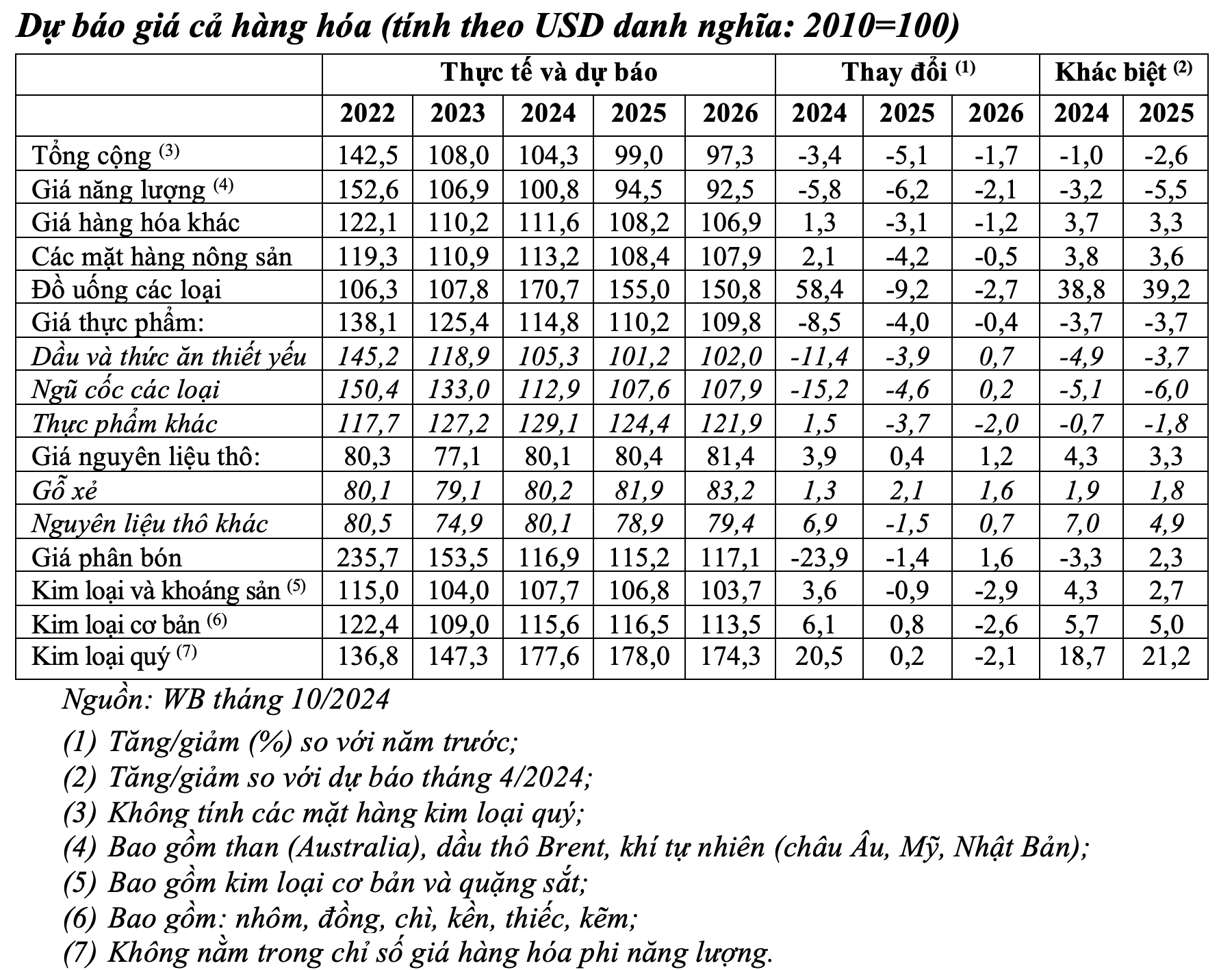 Sau khi giảm 3,0% trong năm 2024, chỉ số giá cả hàng hóa của WB được dự báo tiếp tục giảm 5,0% vào năm 2025 và 2% vào năm 2026. Nguyên nhân chủ yếu dẫn đến xu hướng hạ nhiệt giá cả là do điều kiện cung ứng cải thiện, và xu hướng này có thể sẽ kéo giảm mặt bằng giá cả hàng hóa xuống mức giá thấp nhất kể từ năm 2020, mặc dù vẫn cao hơn 30% so với mức giá trung bình trong giai đoạn 2015-2019.
