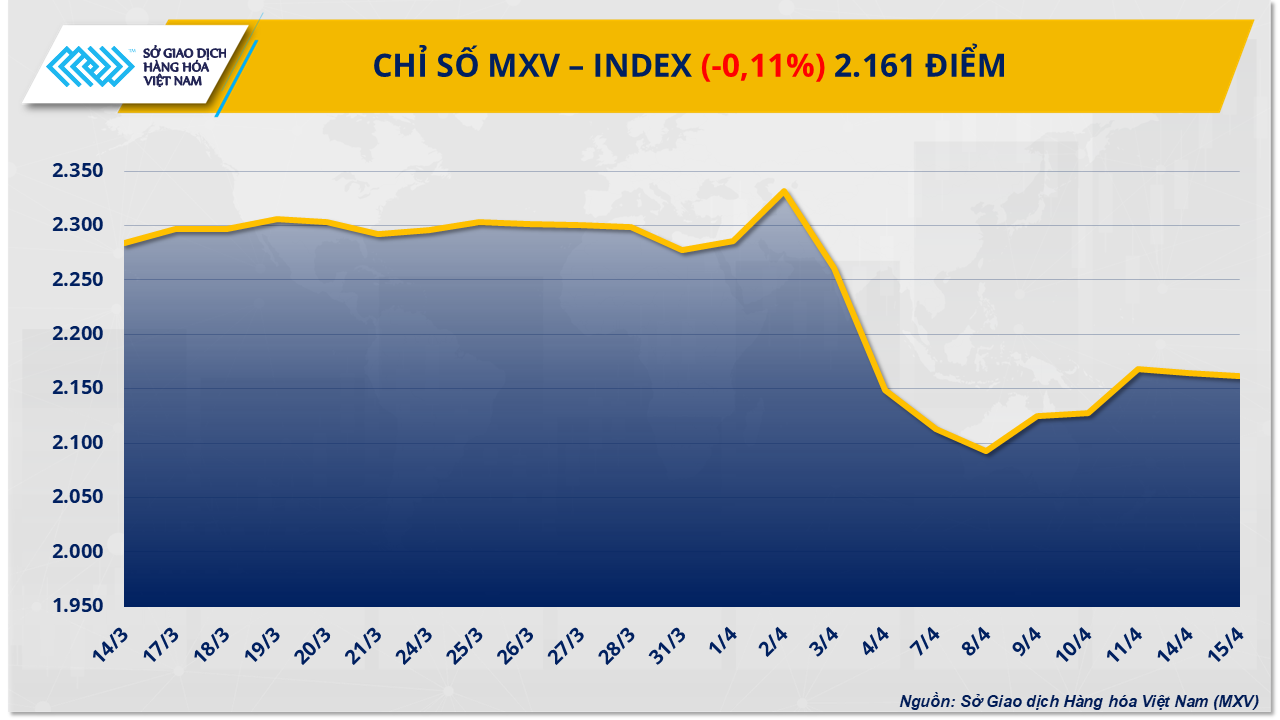 Theo Sở Giao dịch Hàng hóa Việt Nam (MXV), lực bán tiếp tục chiếm ưu thế trên thị trường hàng hóa nguyên liệu thế giới trong phiên giao dịch ngày hôm qua (15/4). Đóng cửa, chỉ số MXV-Index giảm nhẹ 0,1% về mức 2.161 điểm.