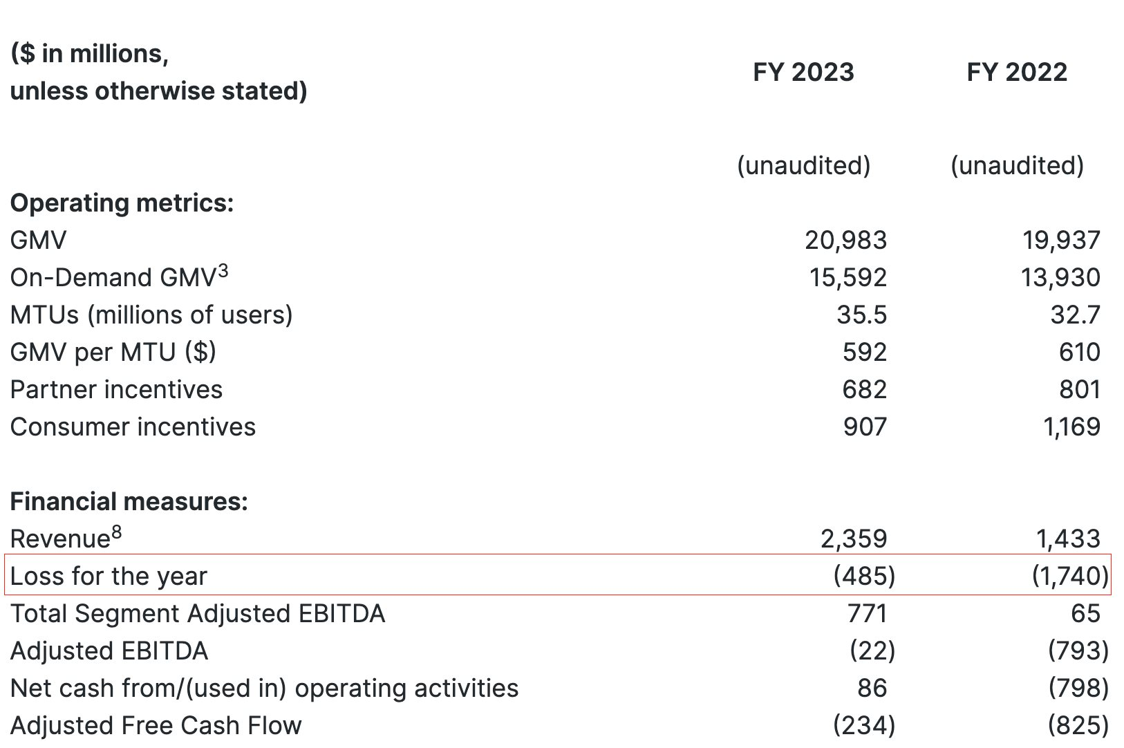 Năm này, Grab lỗ 249 triệu USD trong quý 1 (tương đương -5.861 tỷ đồng), quý 2/2023 lỗ tiếp 148 triệu USD, con số lỗ là 99 triệu USD trước khi đột ngột báo lãi mỏng trong quý 4/2023. Tổng cả năm 2023, Grab lỗ 485 triệu USD (tương đương hơn 11.400 tỷ đồng).