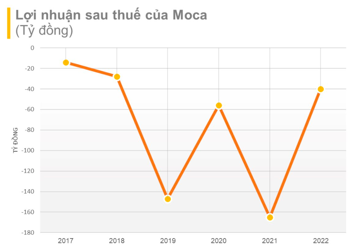 Ghi nhận, kể từ năm 2017 tới năm 2022, Moca vẫn liên tục chìm trong thua lỗ. Năm lỗ lớn nhất của Moca là năm 2021 với số lỗ lên đến 165 tỷ đồng. Năm 2022, Moca lỗ ít hơn với việc lỗ 40 tỷ đồng.
