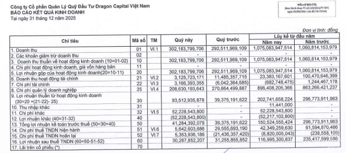 Theo đó, kết thúc năm tài chính 2025 Dragon Capital ghi nhận tổng doanh thu thuần đạt 1.075,08 tỷ đồng, tăng nhẹ 1,35% so với mức 1.060,81 tỷ đồng của năm trước. Riêng trong quý IV, doanh thu đạt 302,18 tỷ đồng, duy trì sự ổn định so với cùng kỳ.