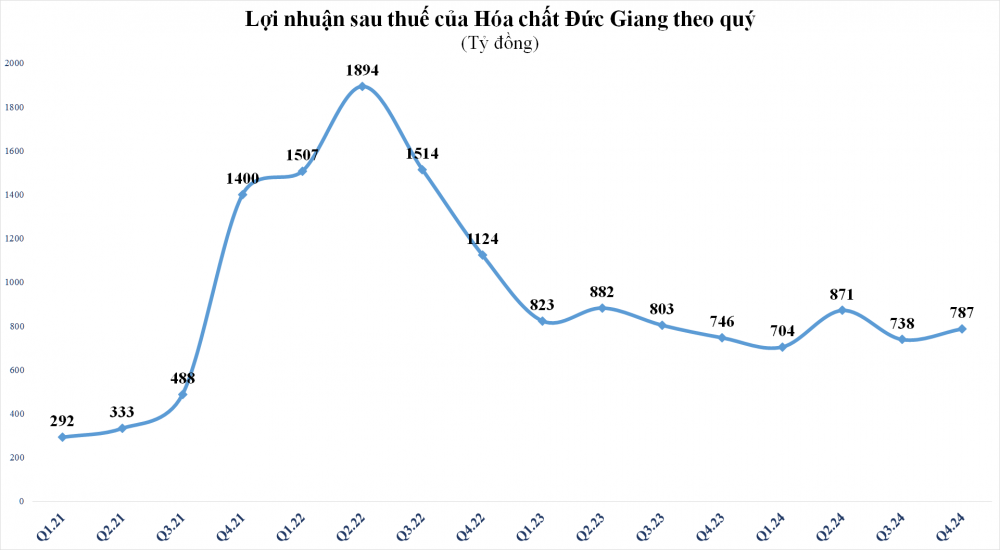Năm 2024, Hóa chất Đức Giang đạt 9.865 tỷ đồng doanh thu thuần và 3.110 tỷ đồng lãi sau thuế, tăng hơn 1% về doanh thu, song lợi nhuận giảm 4% so với năm 2023.