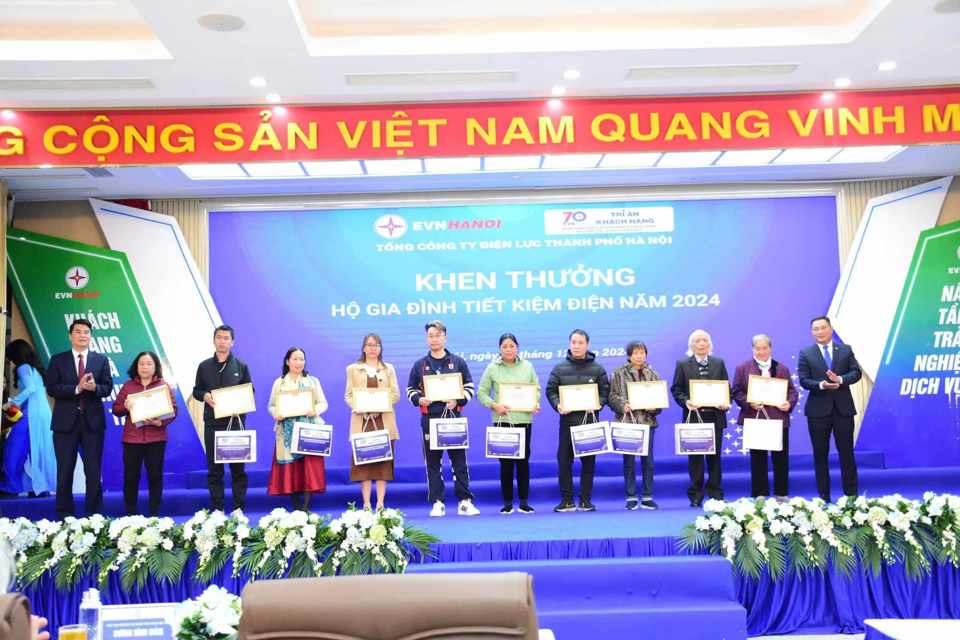 Phó Giám đốc Sở Công Thương TP Hà Nội Nguyễn Đình Thắng và Phó Tổng Giám đốc EVNHANOI Lê Ánh Dương tặng Bằng khen cho đại diện các hộ gia đình sử dụng an toàn, tiết kiệm điện, tiết kiệm năng lượng tiêu biểu Hà Nội năm 2024. Ảnh: Việt Anh