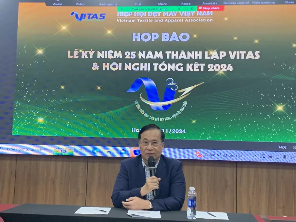 Thông tin tại buổi họp báo ông Vũ Đức Giang- Chủ tịch Hiệp hội Dệt may Việt Nam (Vitas), cho hay, Lễ kỷ niệm 25 năm thành lập Vitas và Tổng kết năm 2024 sẽ được tổ chức vào ngày 13-14/12/2024 tại Quảng Nam. Lễ Kỷ niệm là mốc quan trọng đánh dấu sự trưởng thành và những thành tựu, đóng góp của Vitas vào sự phát triển của ngành, cũng như định hưởng phát triển cho năm 2025 và giai đoạn tiếp theo, giai đoạn của sự bùng nổ trí tuệ nhân tạo, thế giới phẳng, của chuyển đổi số và yêu cầu xanh hóa, phát triển bền vững ngành dệt may Việt Nam.