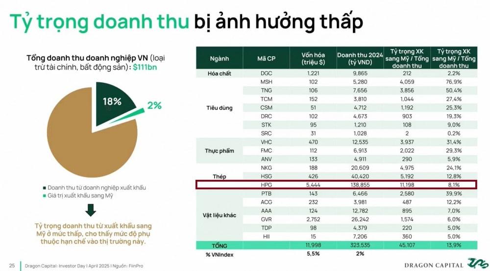 Còn theo thống kê sơ bộ của Dragon Capital, xuất khẩu thép của Hòa Phát sang Mỹ năm 2024 chỉ chiếm trên 8% tổng doanh thu, tương ứng 11.200 tỷ đồng, nên khả năng bị ảnh hưởng không lớn.