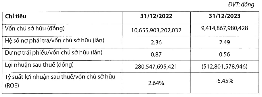 Tại thời điểm cuối năm 2023, vốn chủ sở hữu của công ty giảm 13% so với cùng kỳ, từ 10.656 tỷ đồng còn gần 9.415 tỷ đồng.