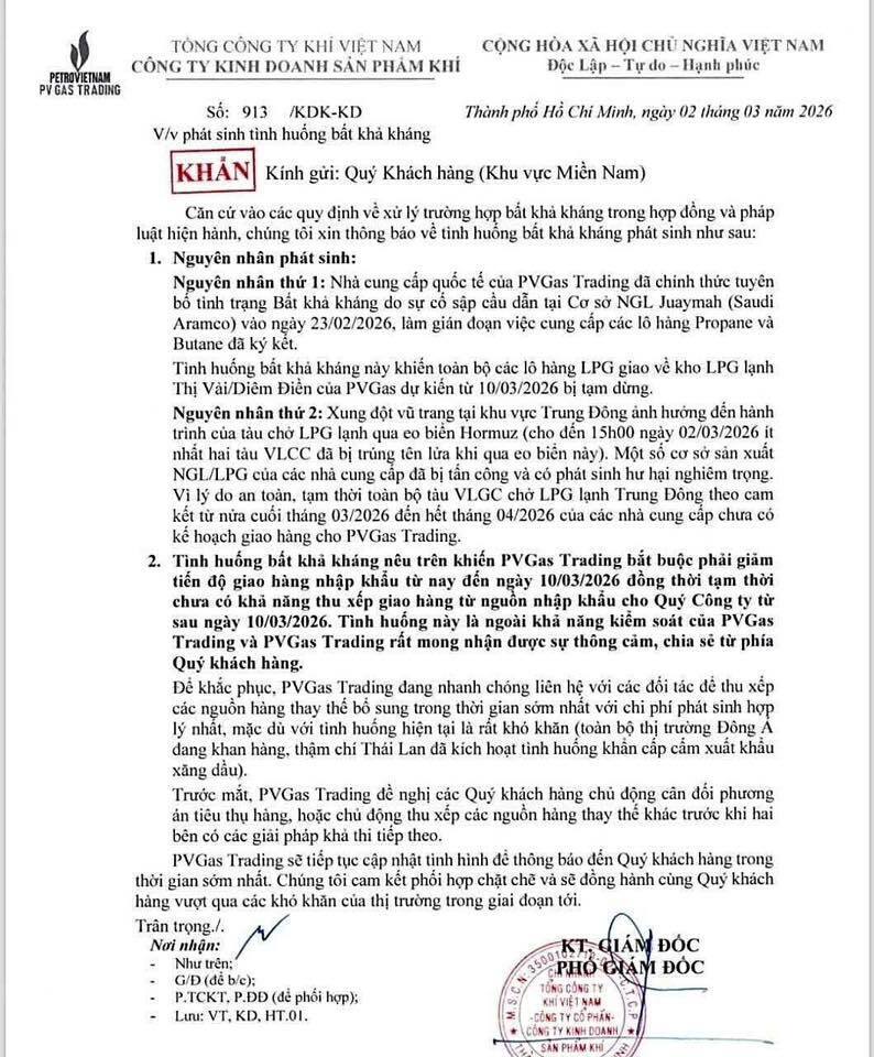 Tối ngày 2/3/2026, Công ty Kinh doanh Sản phẩm khí - PVGas Trading (thuộc Tổng công ty Khí Việt Nam) đã có văn bản gửi khách hàng khu vực miền Nam về việc phát sinh tình huống bất khả kháng.