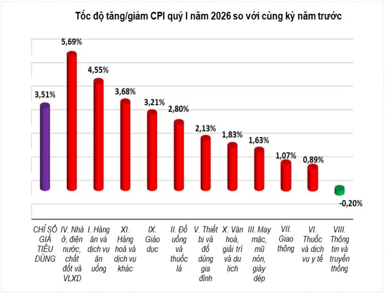 Theo Cục Thống kê, có 7 yếu tố làm CPI quý I/2026 tăng 3,51% so với cùng kỳ năm 2025.
