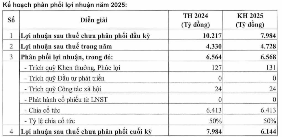 Công ty cũng dự kiến trình cổ đông tăng mức trả cổ tức năm 2024 lên 50% (tương đương số tiền chi trả cổ tức khoảng 6.400 tỷ đồng), thay vì 35% như đã được thông qua tại ĐHĐCĐ thường niên 2024.