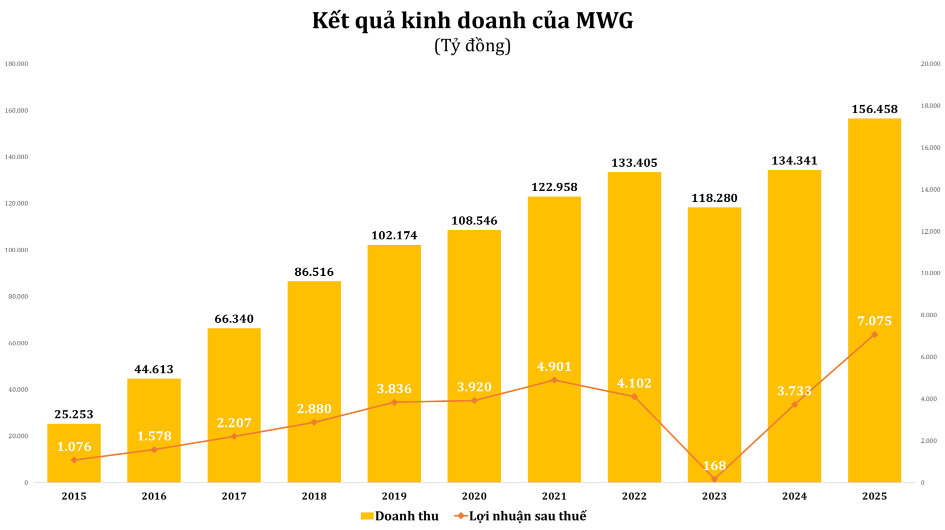 Năm 2025, MWG đặt mục tiêu doanh thu thuần đạt 150.000 tỷ đồng và lợi nhuận sau thuế đạt 4.850 tỷ đồng, lần lượt tăng 12% và 30% so với thực hiện 2024. Như vậy, kết thúc năm 2025, công ty đã vượt 4,3% chỉ tiêu doanh thu và vượt 45,9% kế hoạch lợi nhuận cả năm.