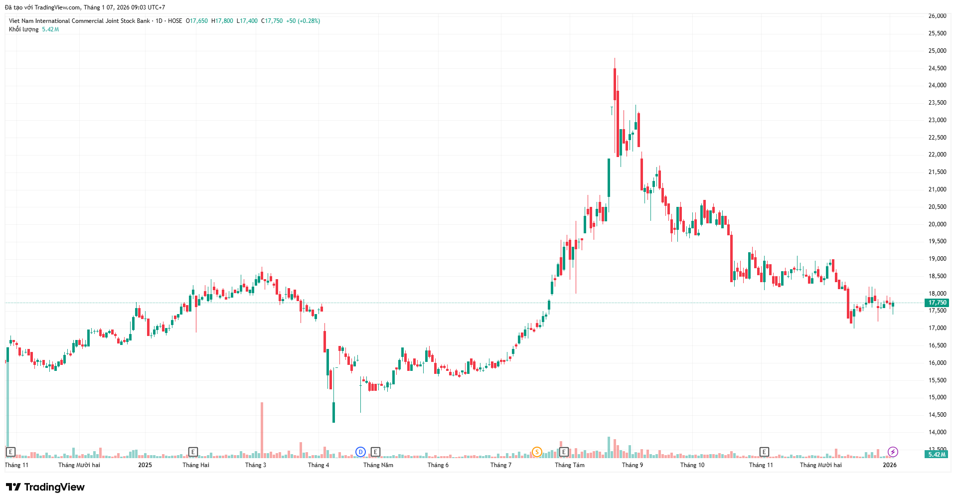 Kết thúc phiên giao dịch ngày 6/1/2026, giá cổ phiếu VIB ở mức 17.750 đồng/cổ phiếu, tăng 2,6% so với đầu năm 2025.