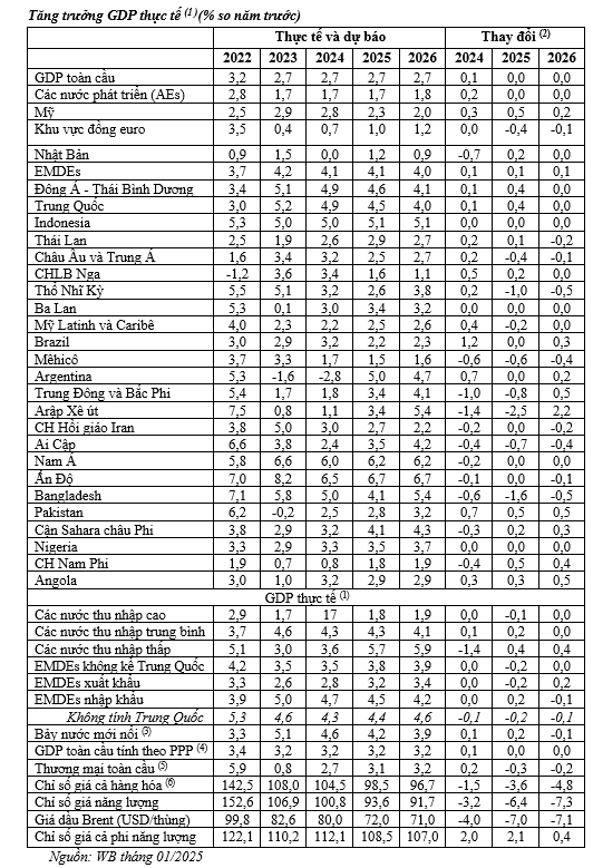 Theo nhận định của WB, kinh tế toàn cầu đang ổn định và phát triển rộng khắp, lạm phát giảm dần về mục tiêu đề ra và các biện pháp nới lỏng tiền tệ đã hỗ trợ hoạt động kinh tế tại các nước phát triển (AEs) cũng như tại các nước đang phát triển và mới nổi (EMDEs). GDP được dự báo sẽ tăng 2,7% trong năm 2025 và 2026, khi hoạt động thương mại và đầu tư tăng vững. Tuy nhiên, triển vọng tăng trưởng có vẻ chưa đủ để bù đắp những thiệt hại do tác động tiêu cực của các cú sốc liên tiếp trong những năm qua, nhất là đối với các nước dễ bị tổn thương.