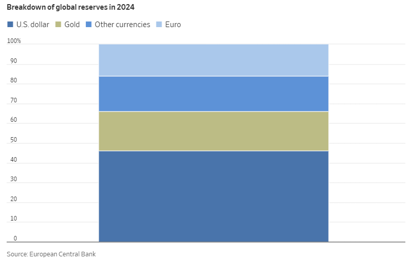 Cơ cấu dự trữ toàn cầu trong năm 2024 (đồng USD, vàng, các loại ngoại tệ khác, Euro). Nguồn: Ngân hàng Trung ương châu Âu